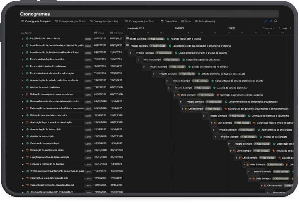 Monte cronogramas claros, organizados por etapa e com datas de início e fim. É fácil de atualizar conforme o andamento da obra, e você ainda pode visualizar tudo em formato de calendário, lista ou quadro, como preferir.